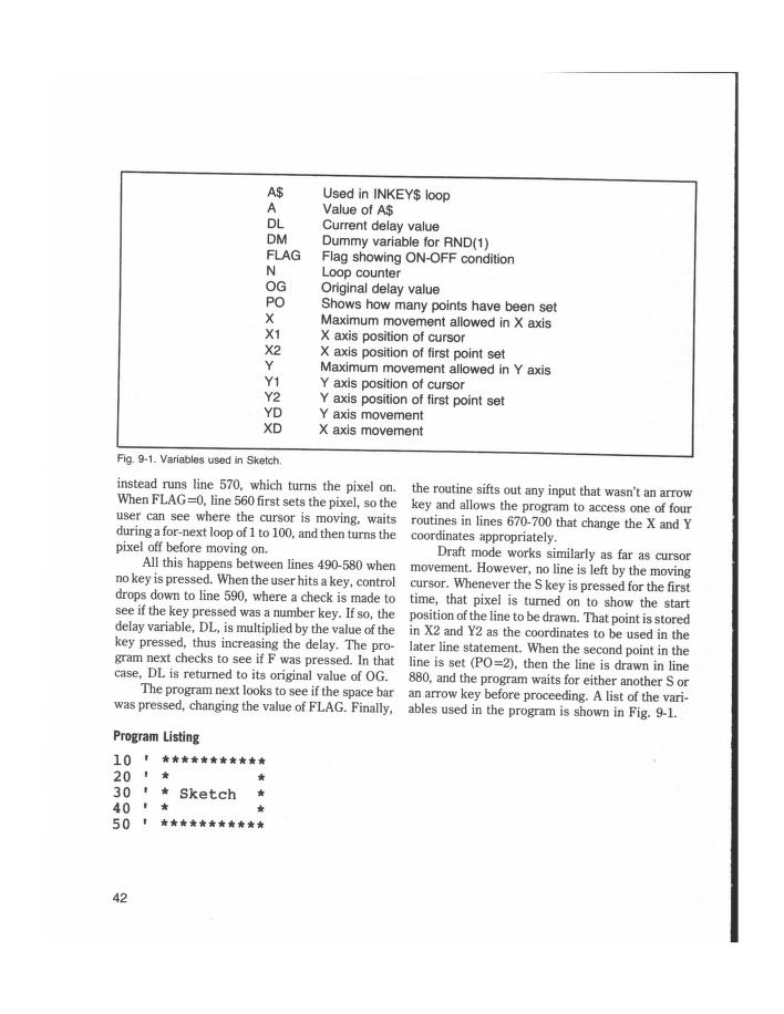 Please find reproduced here a working port of SKETCH for the TRS Model 100 to Stefan’s BASIC for the Arduino micro-controller platform.